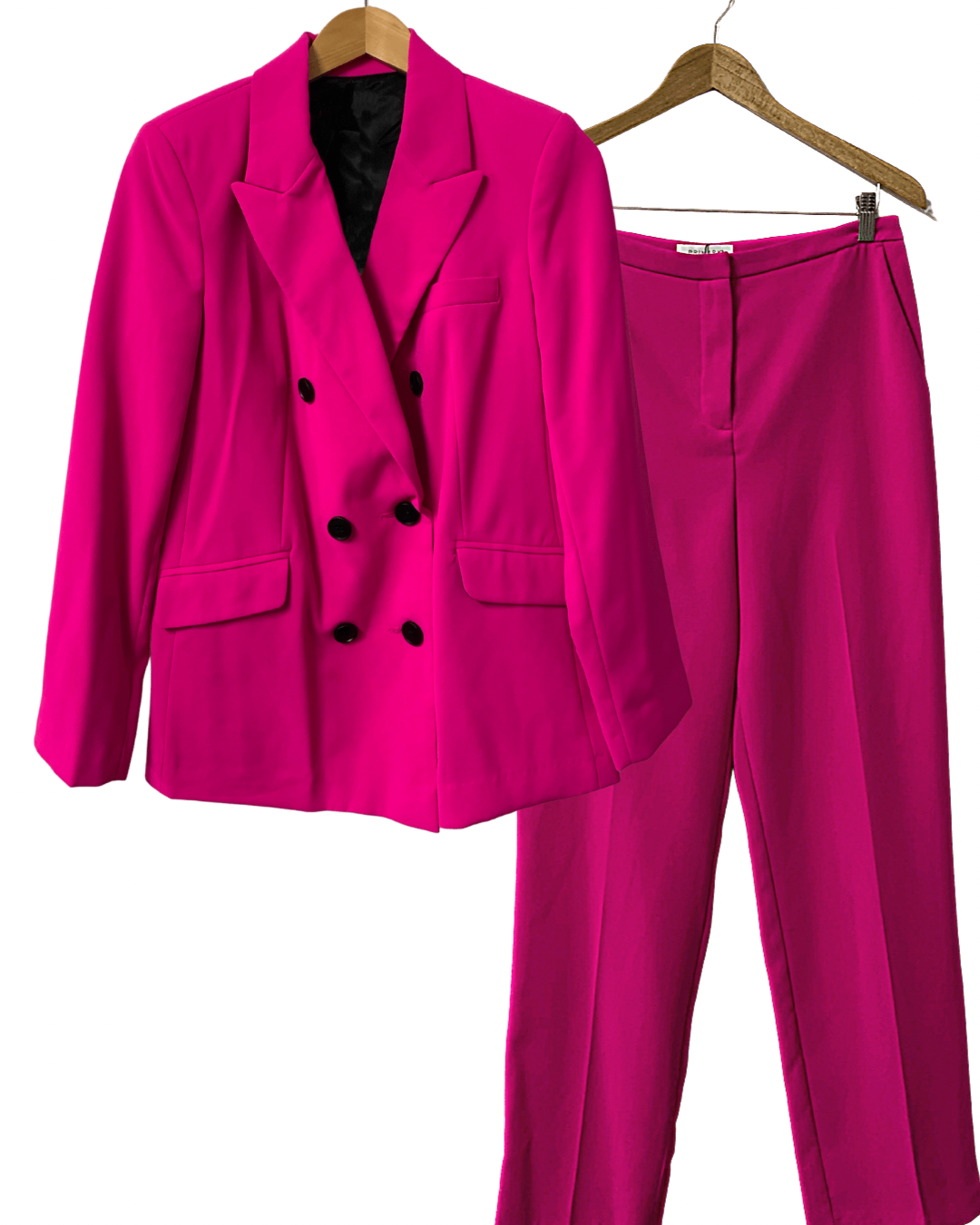 Relaxed fit double breast jacket and pant suit. Available in pink and aqua